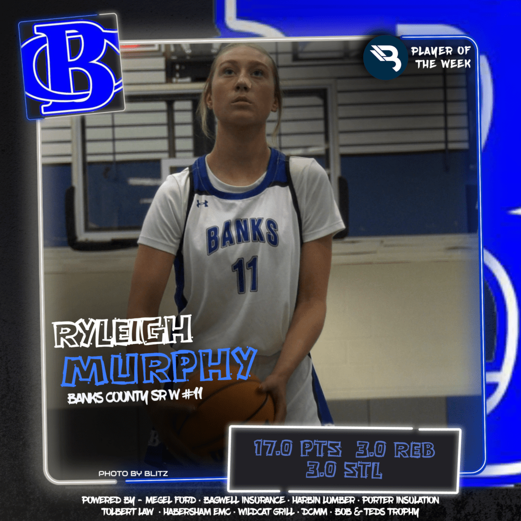 The BLITZ Girls Basketball Players of the Week are Ryleigh Murphy (Banks County) and LB Kafsky (Tallulah Falls). Murphy won the Fan Vote with 8,301 of the 14,991 total votes. Kafsky was the BLITZ Pick.