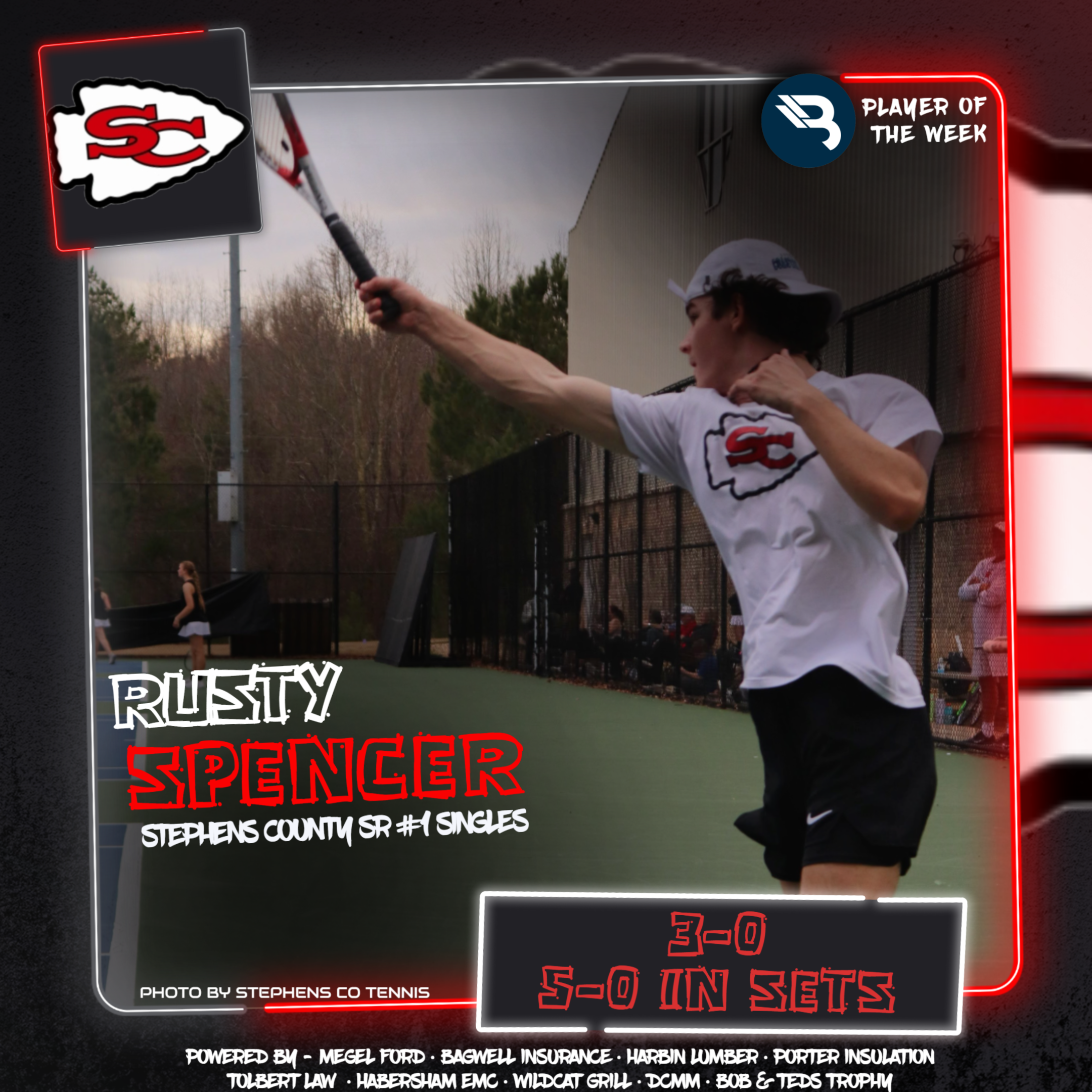 For the past two seasons, Rusty Spencer has anchored 1-singles for Stephens County. The senior, who was 1st Team All-Region last year, is 3-0 already with straight-set wins over East Hall, BASA, and East Jackson. He’s at 5-0 in sets overall, and dominated his EJ opponent 6-0, 6-0. This is his second POW award.