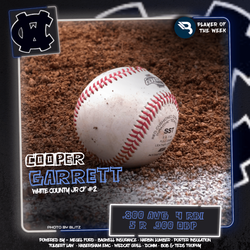 Cooper Garrett had an incredible week. Look at the facts – The junior center fielder hit .800, going 4-for-5. The Warriors’ junior had four RBI, five runs, a double, four walks, a stolen base, a hit-by-pitch, and a walk-off double for White County. His OBP was a ridiculous .900, and his OPS sat at 1.900. This is his first POW award.