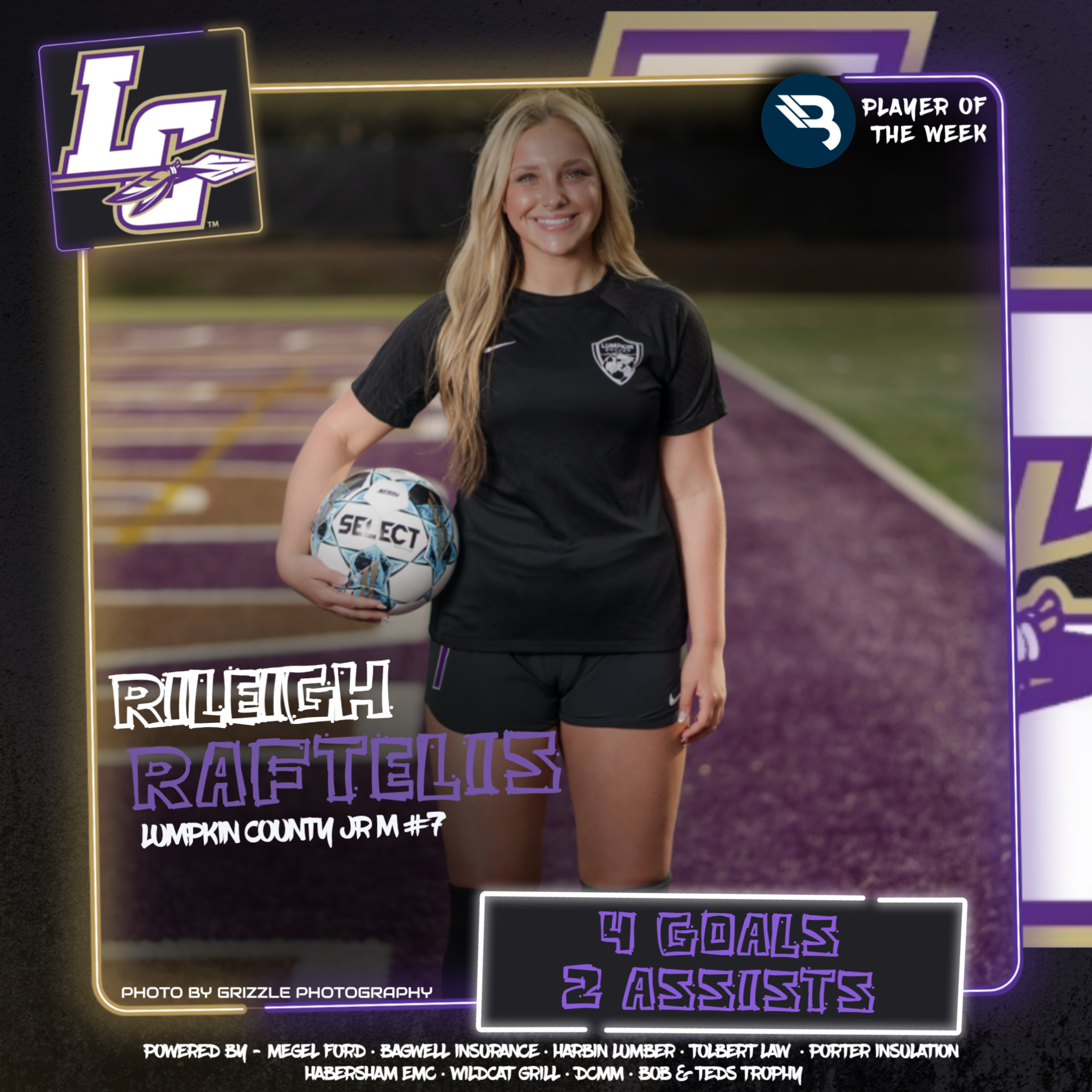 Lumpkin County’s top scorer and most consistent threat has been Rileigh Raftelis. The junior midfielder posted four goals and two assists for the Lady Indians last week in two games, earning her first POW award. She’s the 200th Lumpkin County athlete all-time to win POW honors.