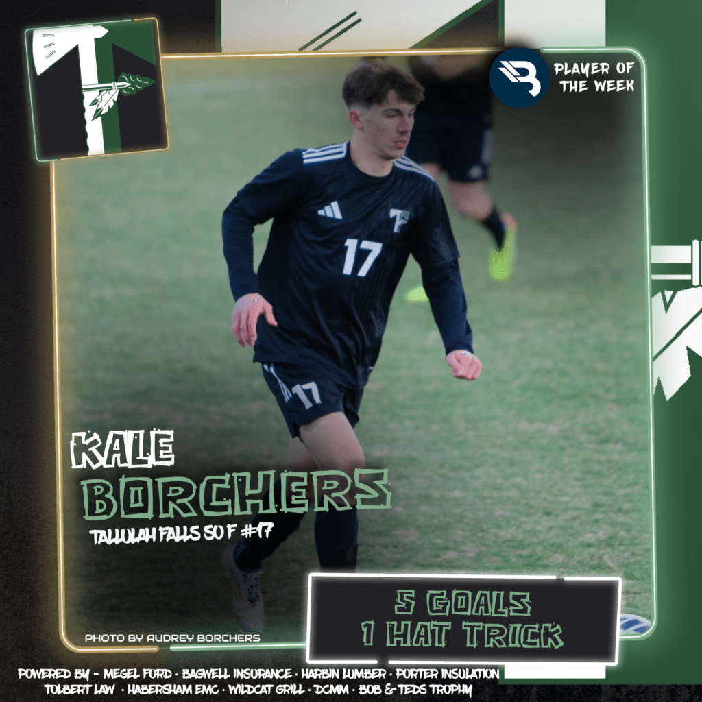 TFS standout sophomore Kale Borchers has long been scoring goals. For #2-ranked Tallulah Falls last week, the Indians’ forward notched five goals, including a hat trick. This is his 1st POW award.