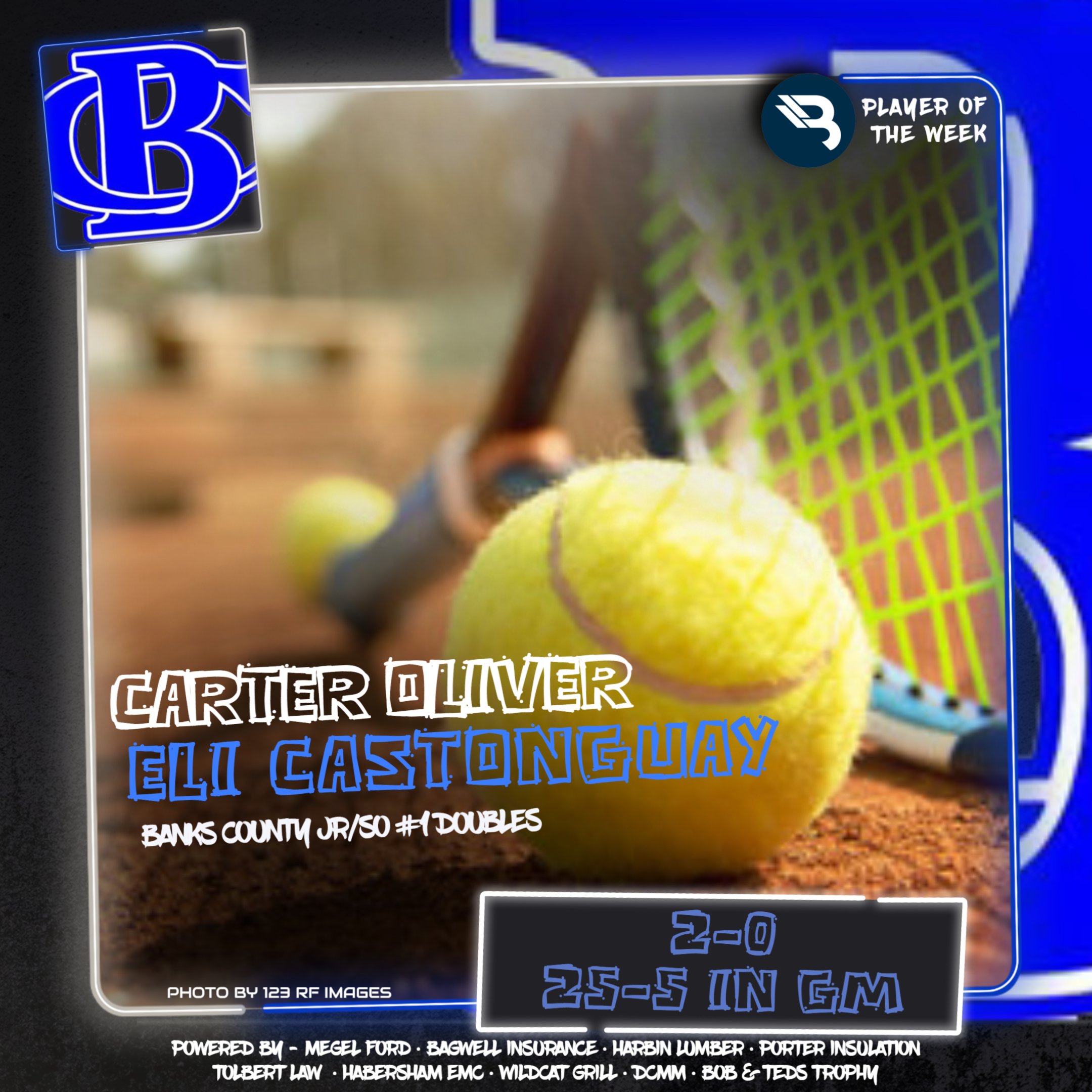 The BLITZ Boys Tennis Players of the Week are Carter Oliver & Eli Castonguay (Banks County) and Tanner Davis (Tallulah Falls). The Banks duo earned the Fan Vote with 1,383 of the 1,866 total votes. Davis was the BLITZ Pick.