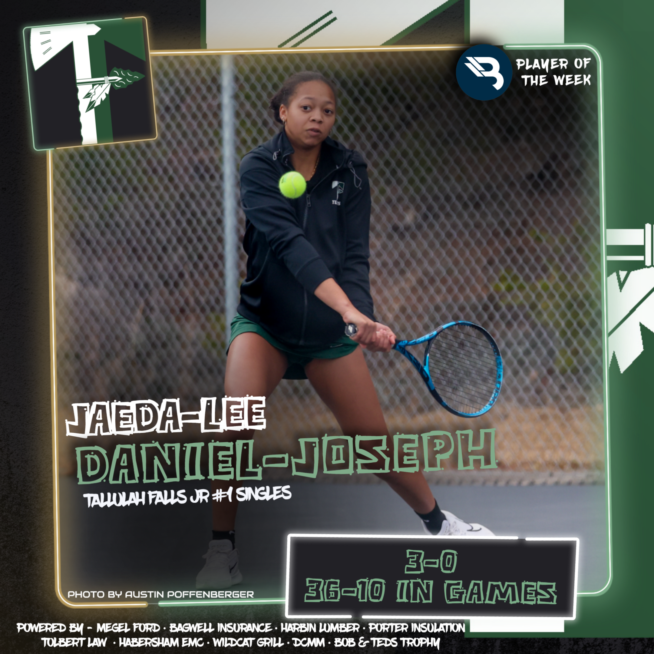 Tallulah Falls’ star junior at 1-singles, Jaeda-Lee Daniel-Joseph, went 3-0 in a busy week. The 3-time POW winner was 36-10 in games overall, and continues to add on as the all-time wins leader for the Lady Indians.