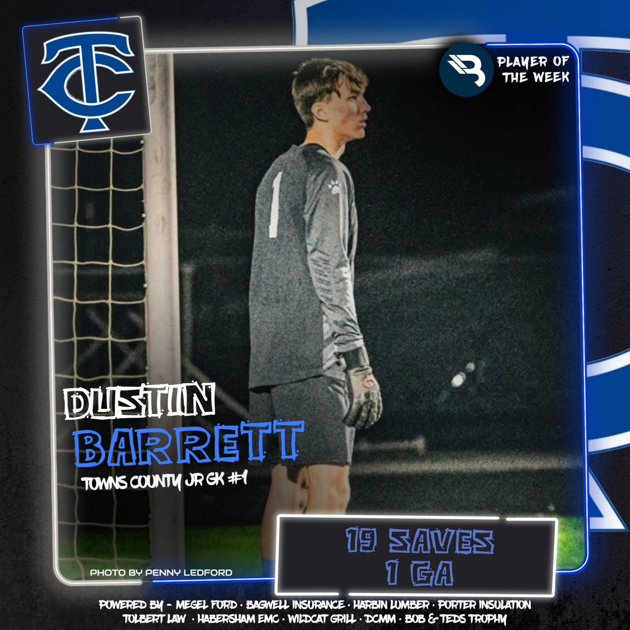 Dustin Barrett is no stranger to coming up clutch. The Towns County JR GK notched 19 saves and allowed just one goal, and make PK stops to preserve a win for the high-flying Indians. This is his 7th career POW award.
