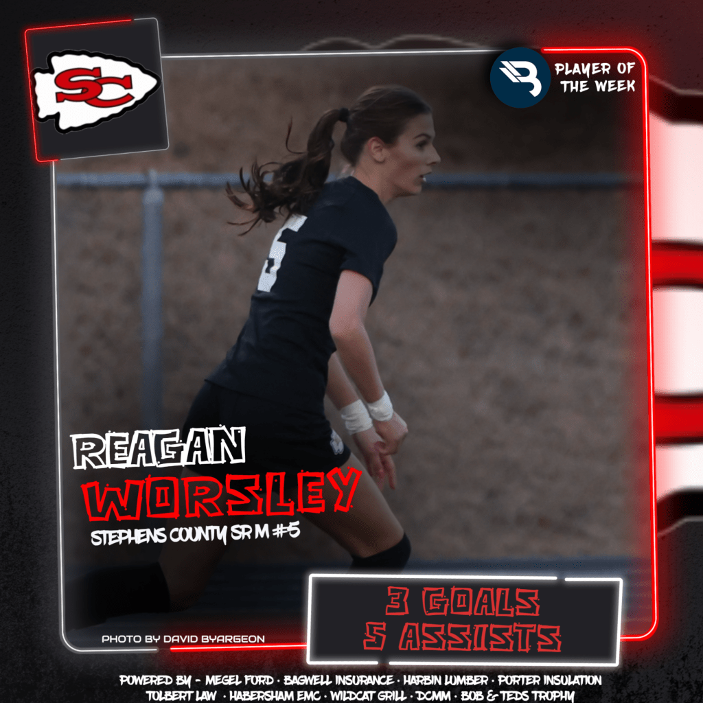 The BLITZ Soccer Players of the Week are Sophia Pratt (Banks County), Caden Coggins (Towns County), and Reagan Worsley (Stephens County). Pratt earned the Fan Vote with 5,348 of the 8,784 total votes. Coggins and Worsley were the BLITZ Picks.