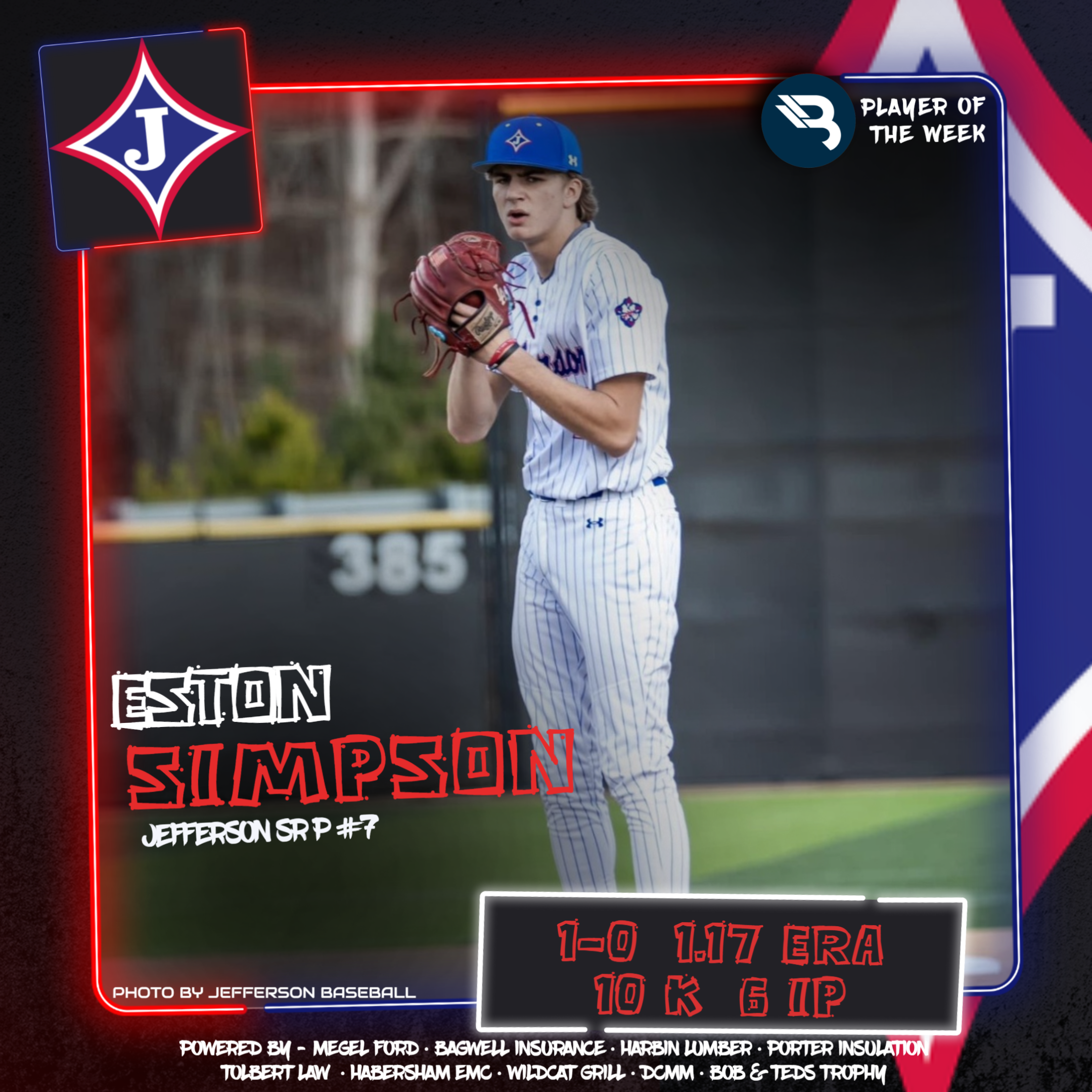 The BLITZ Baseball Players of the Week are Tyler Richards (Union County), Charlie Mills (Habersham Central), and Eston Simpson (Jefferson). Richards earned the Fan Vote with 7,872 of the 11,559 total votes. Mills and Simpson were the BLITZ Picks.