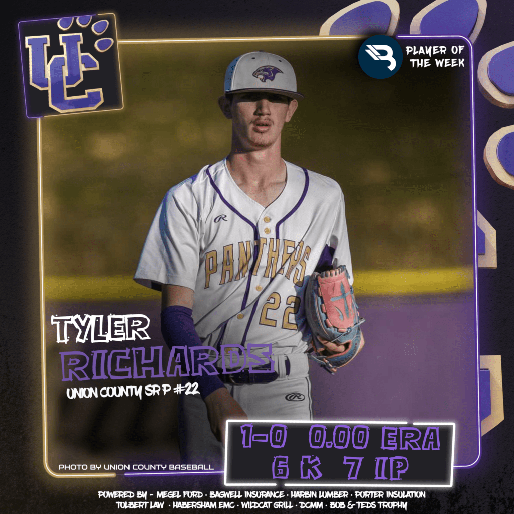 Tyler Richards pitched brilliantly last week for the Panthers. The Union County senior pitcher earned the win with a spotless 0.00 ERA, striking out six batters in a 3-hit shutout. This is his first POW award.