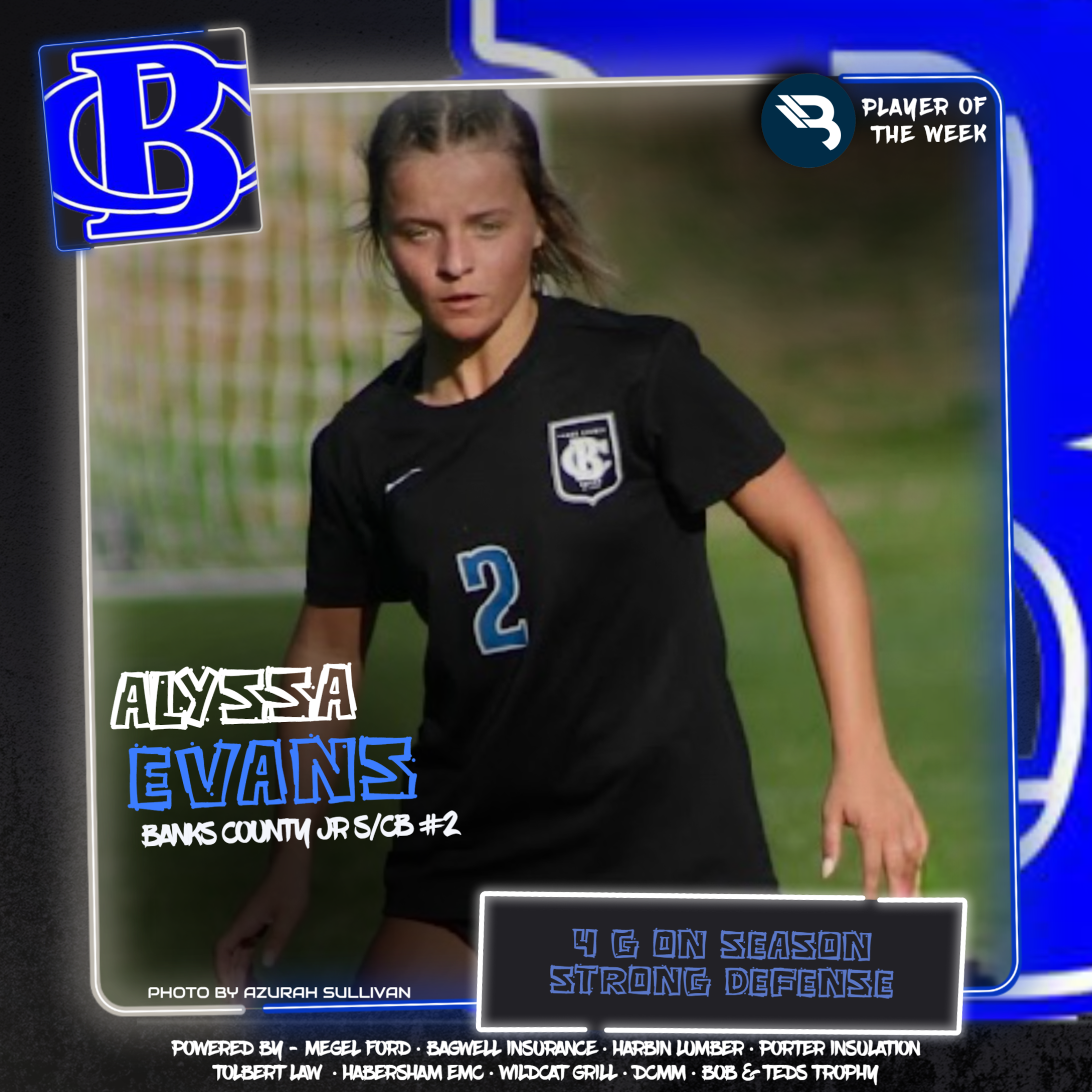 The BLITZ Soccer Players of the Week are Alyssa Evans (Banks County), Kaitlyn Johnson (Lumpkin County), and Emma Windham (White County). Evans earned the Fan Vote with 5,350 of the 12,952 total votes. Johnson and Windham were the BLITZ Picks.