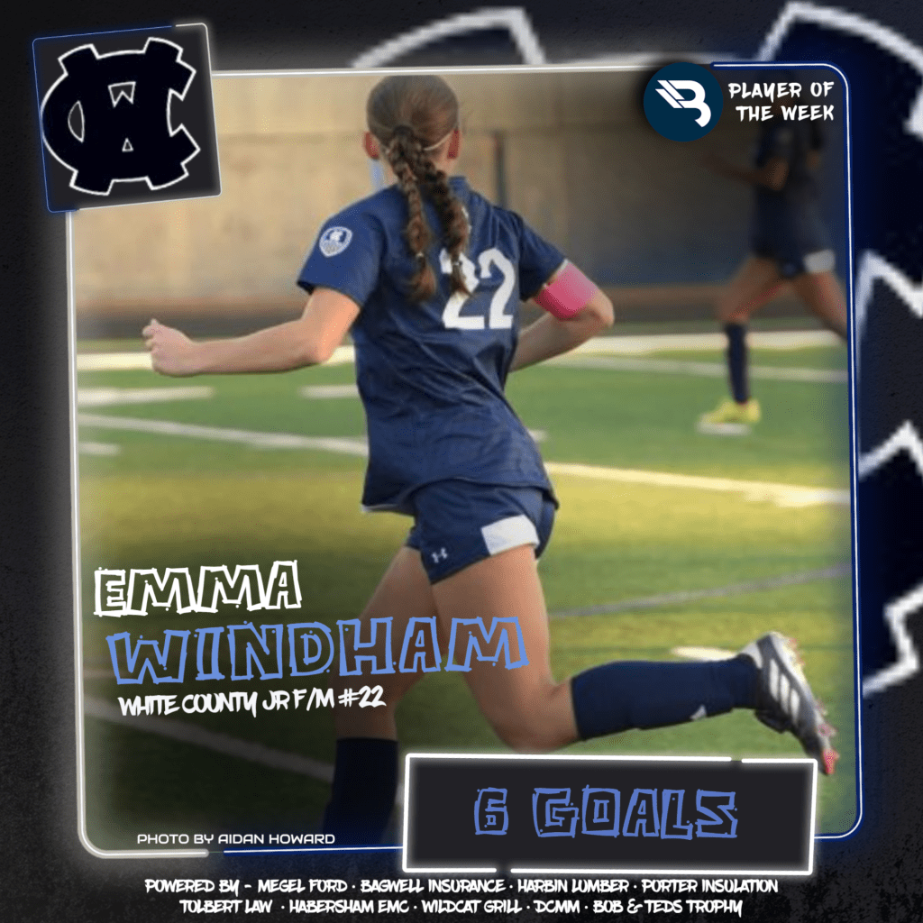 Emma Windham posted a double hat trick, scoring six times for White County last week. The Lady Warriors’ junior forward/midfielder earns her third career POW award.