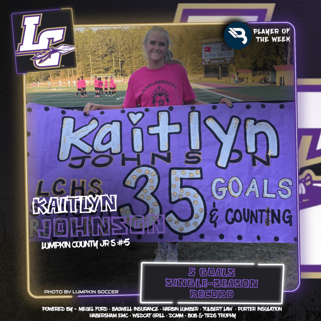 Lumpkin County has a new single-season goal champion in Kaitlyn Johnson. The junior posted a 5-goal game, surpassing the mark of 34. She has 38 on the season entering the postseason. This is her second POW award.