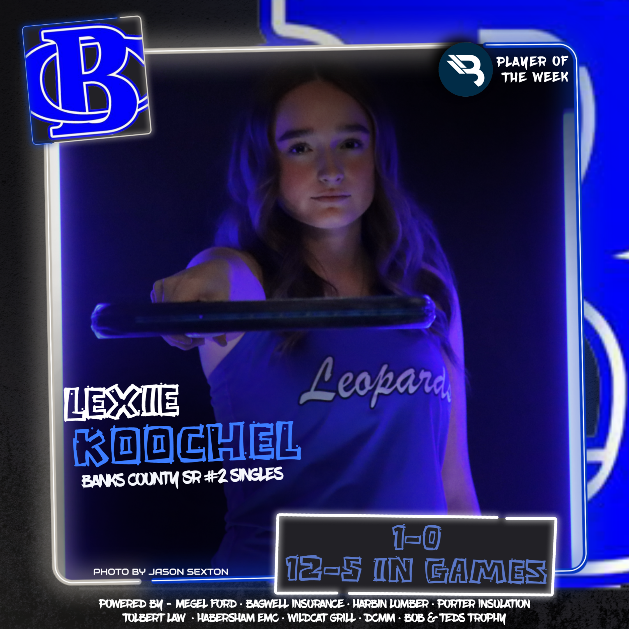 Lexie Koochel went 1-0 last week, winning her state playoff round one matchup for Banks County. The senior 2-singles player was 12-5 overall in games, taking her second career POW award.