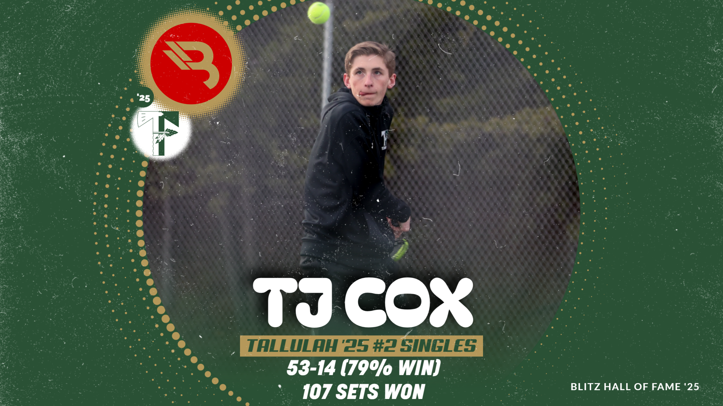 TJ Cox had a consistent career at 2-singles for Tallulah Falls. He was as reliable as any player in the area, posting a total mark of 53-14, ending his career with the 2nd-most wins in TFS history. He won 107 sets and 79% of his total matches, and had several clinching matches including for a region title as just a freshman while going 8-4. He was a perfect 15-0 as a sophomore in 2023, 12-6 in 2024 as a junior, and 18-4 as a senior in a State Runner-Up finish for the team in 2025. His 18 wins that year tied the school’s single-season record. (1,432 votes)