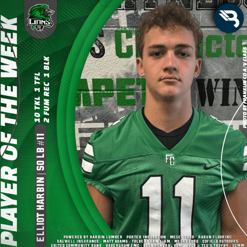 Talk about a defensive clinic! Elliot Harbin had 10 tackles, including one behind the line. The Franklin County sophomore LB had two fumble recoveries, and also blocked a kick. This is his first POW award.
