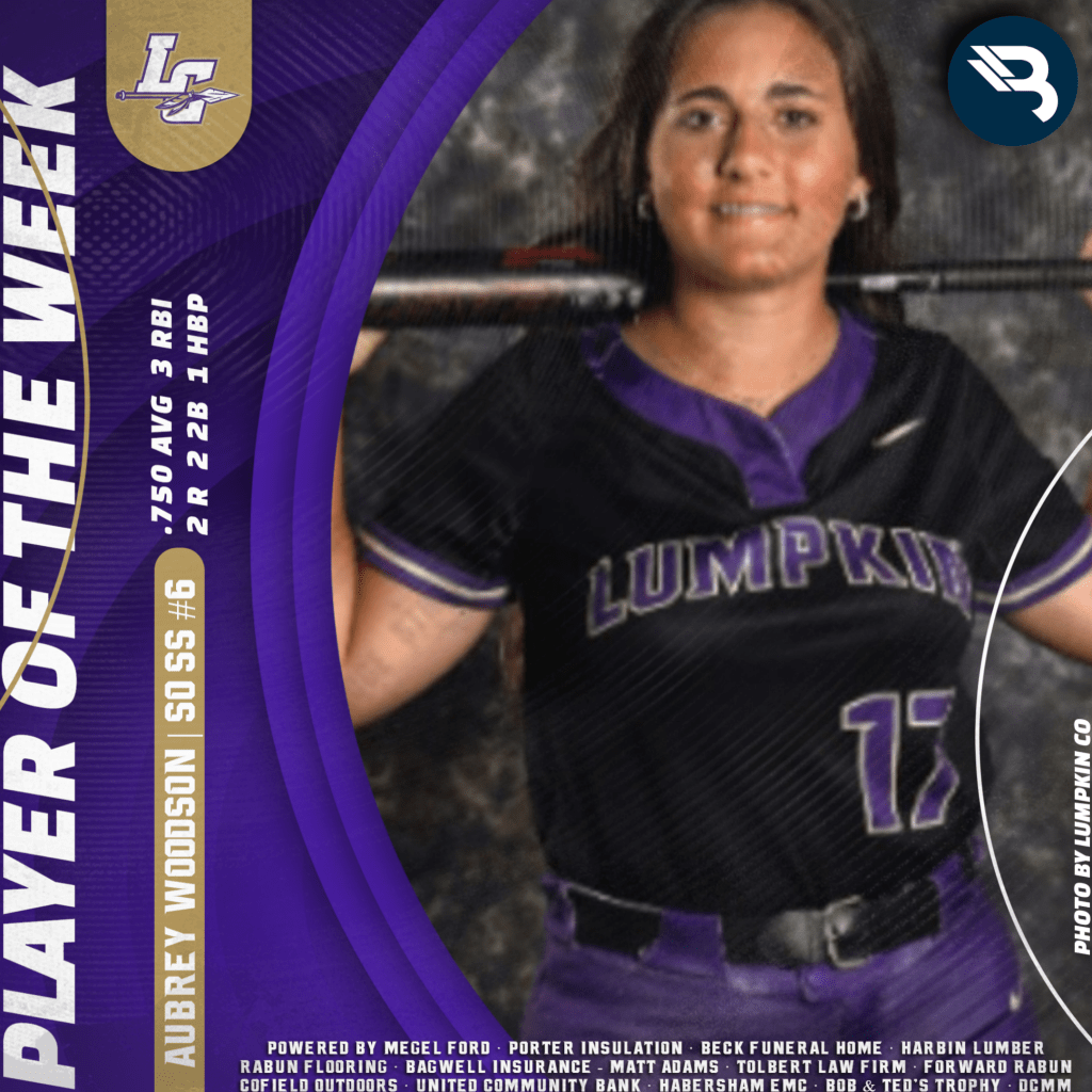 Lumpkin County sophomore Aubrey Woodson had a great week, hitting .750 with three RBI, two runs, two doubles, and a hit by pitch. This is the first award for the infielder.