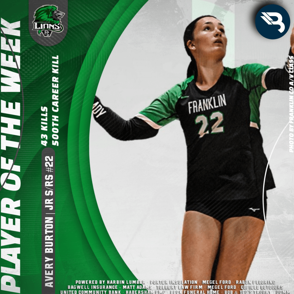 Avery Burton notched her 500th career kill for Franklin County last week. The junior setter also had 43 kills overall for the week, and takes her first POW award.