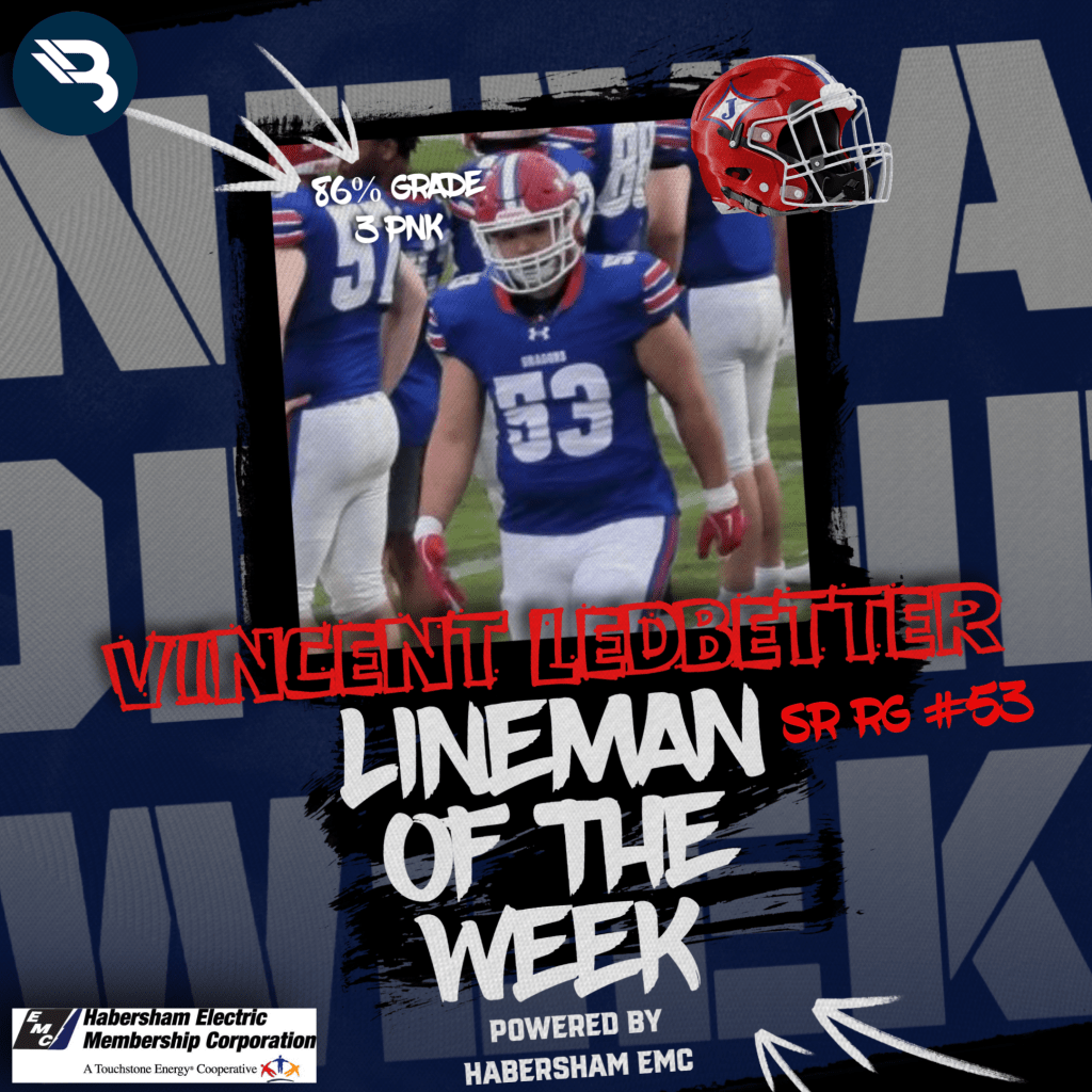 Vince Ledbetter for the Dragons had a great performance at Clarke Central. The senior registered an 86% grade and had three pancake blocks. This is his first POW award.