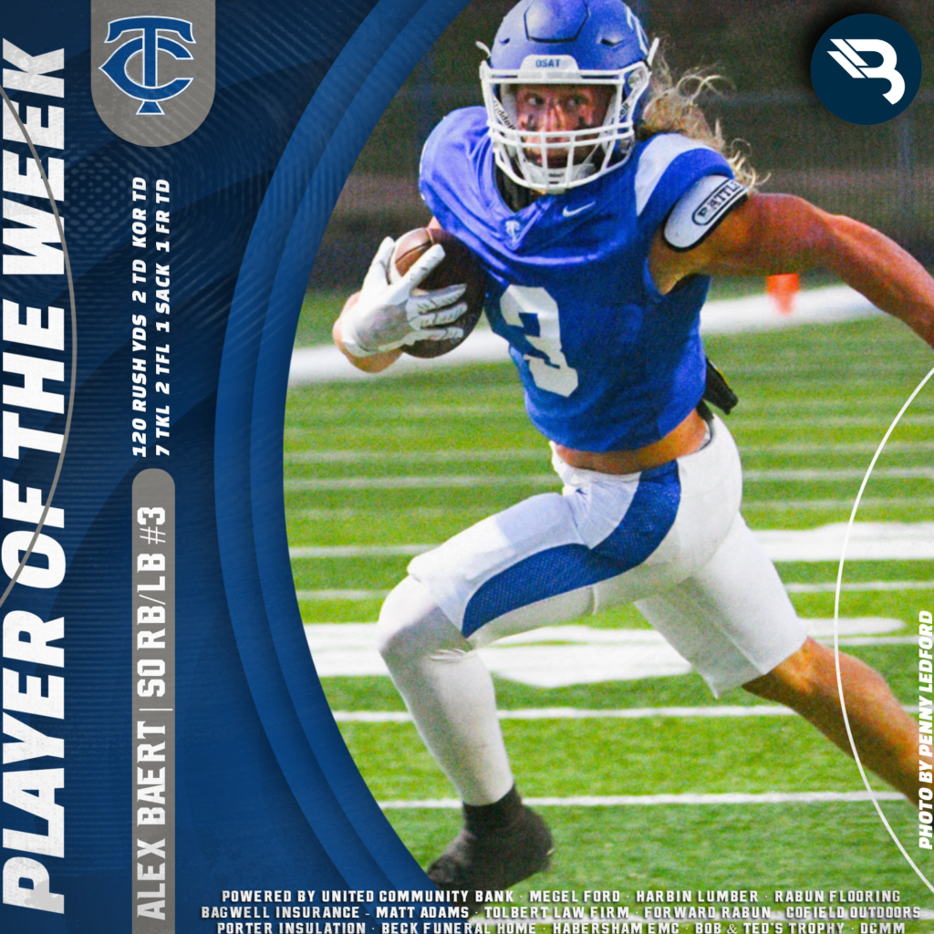 Alex Baert had a game he’ll remember for the rest of his life. He collected four total scores, and at least one in each phase – offense, defense, special teams. Towns County’s star sophomore had 120 rush yards and two TDs, and had a 91-yard kickoff return for a TD. Defensively, he added seven tackles (two for loss) with a sack and a fumble recovery for a TD. This is his first POW award.