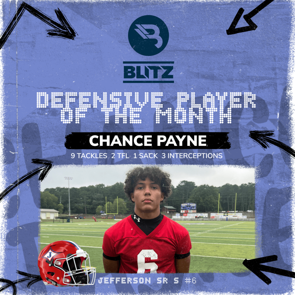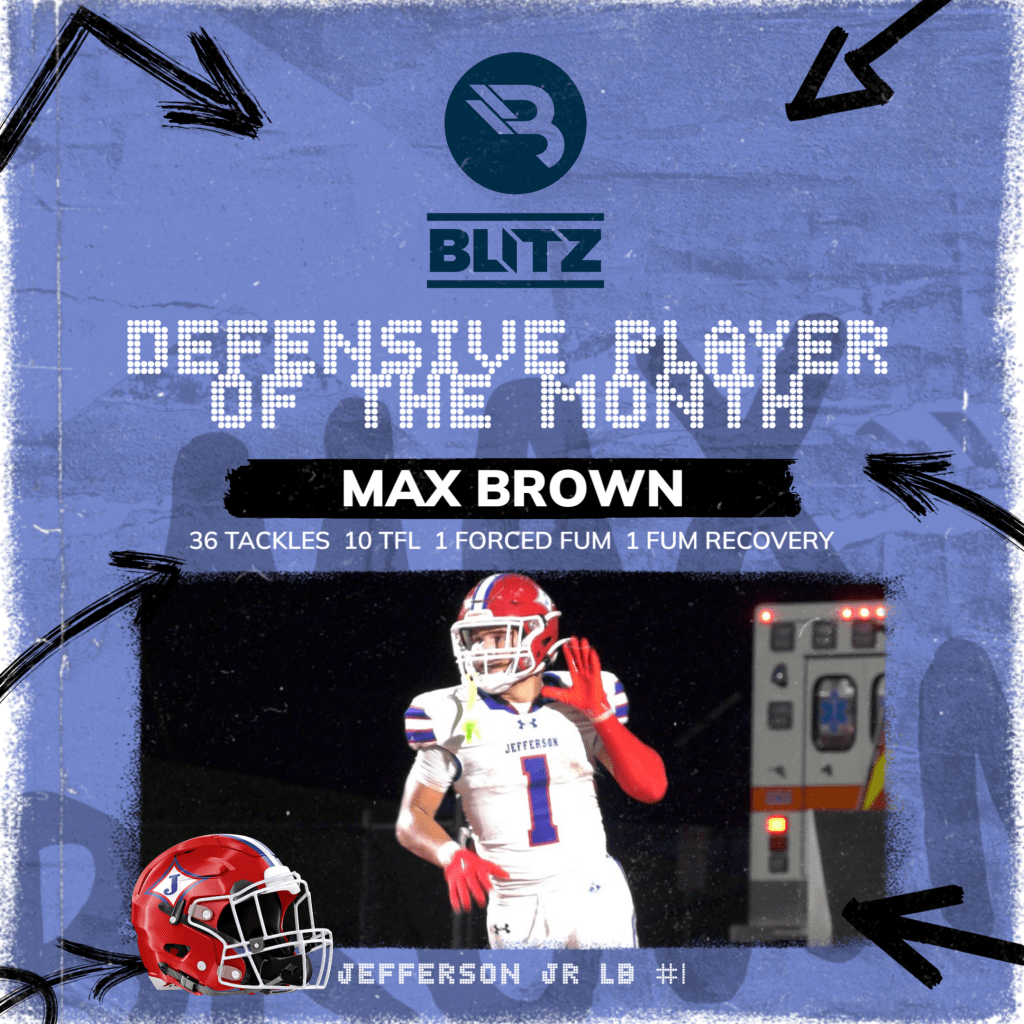 The BLITZ Defensive Players of the Month for Weeks 1-4 are Jefferson teammates Chance Payne and Max Brown. Payne won the Fan Vote with 11,031 of the 36,315 total votes. Brown was the BLITZ Pick.