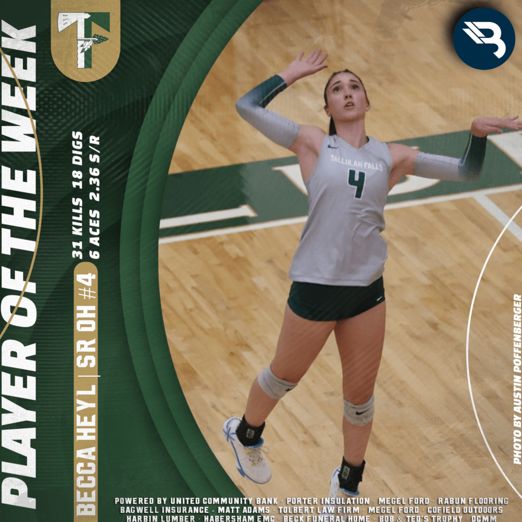 The BLITZ Volleyball Players of the Week are Emmy Barton (White County) and Becca Heyl (Tallulah Falls). Barton won the Fan Vote with 6,040 of the 9,234 total votes. Heyl was the BLITZ Pick.