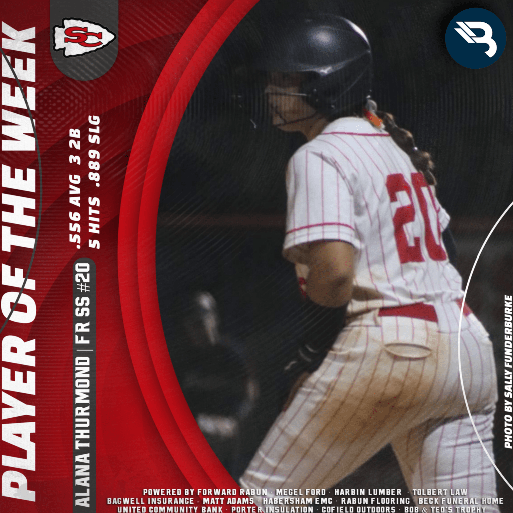 Alana Thurmond played very well last week. The Stephens County freshman utility player and shortstop hit .556, collecting five hits including three doubles. She had a .889 SLG and 1.444 OPS. This is her first POW award.