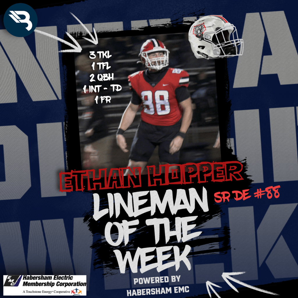 Rabun County senior lineman Ethan Hopper had a night he’ll never forget. The defensive end had three tackles (one for loss), a couple of QB hurries, but even more special – a fumble recovery and a pick-6, giving him his first-ever TD. This is his second career POW award.
