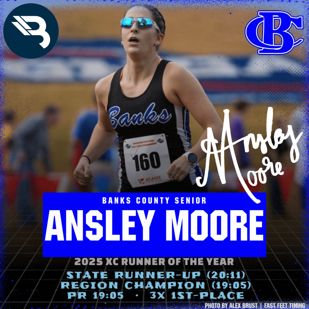 Moore is the first Banks County Lady Leopard to claim the Girls XC ROY award. She’s the first senior to win it since 2022, as eight times it has gone to a junior. Last year’s winner, Lola Hunter, was a finalist this year as well.