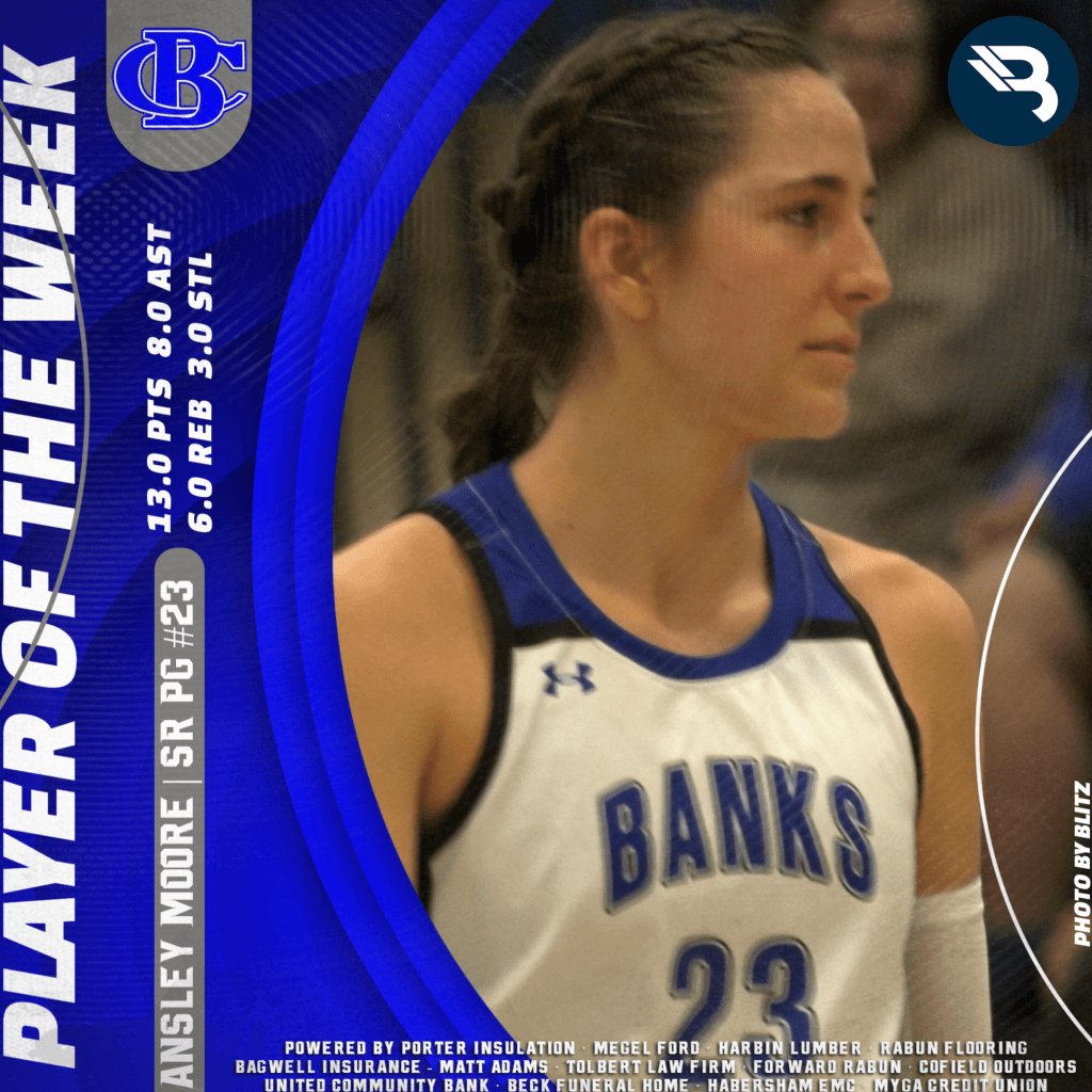Ansley Moore is an all-around athlete, and now has a BLITZ POW award in XC, track and field, and basketball. The senior point guard showed out for Banks County last week, averaging 13.0 points, 8.0 assists, 6.0 rebounds, and 3.0 steals over a 2-game stretch for the Lady Leopards.