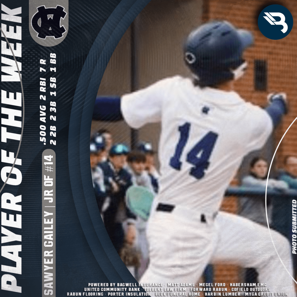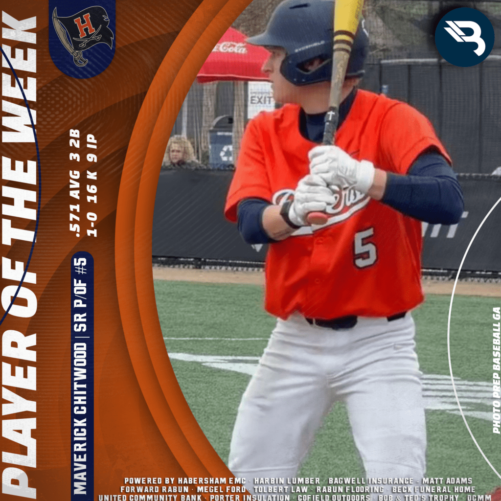 The BLITZ Baseball Players of the Week are Sawyer Gailey (White) and Maverick Chitwood (Habersham Central). Gailey won the Fan Vote with 4,325 of the 8,200 total votes. Chitwood was the BLITZ Pick.