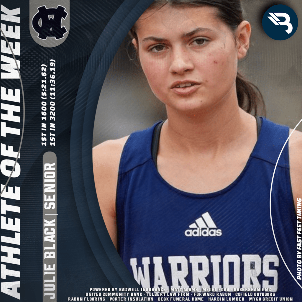 Julie Black had a great showing in White County’s meet last week. The Lady Warriors’ senior was 1st in the 1600 (5:21) and 1st in the 3200 (11:36). This is her second career POW award.