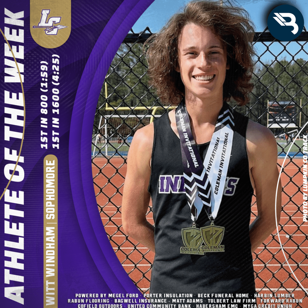 Distance star Witt Windham earns his FIFTH BLITZ POW award this year (four in XC season). The sophomore for Lumpkin placed 1st in the 800 with a 1:59, and 1st in the 1600 with a 4:25 in the Christian Coleman Invite.