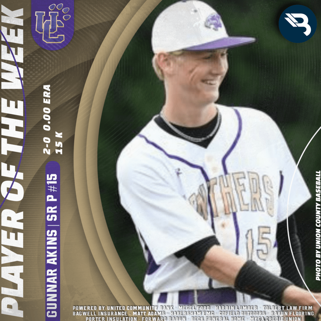 Gunnar Akins shoved last week for Union County. The Panthers’ ace was 2-0 with a perfect 0.00 ERA, striking out 15 batters in the process. This is his second POW award.