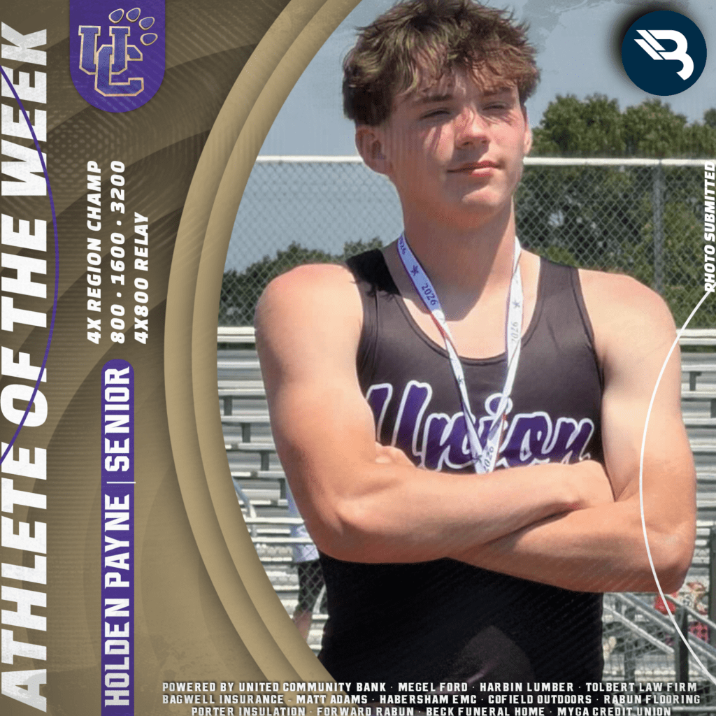 Holden Payne helped guide Union County to a team region title. The senior won the 800 (2:02.32), 1600 (4:41.73), and 3200 (10:21.00). This is his first POW award.