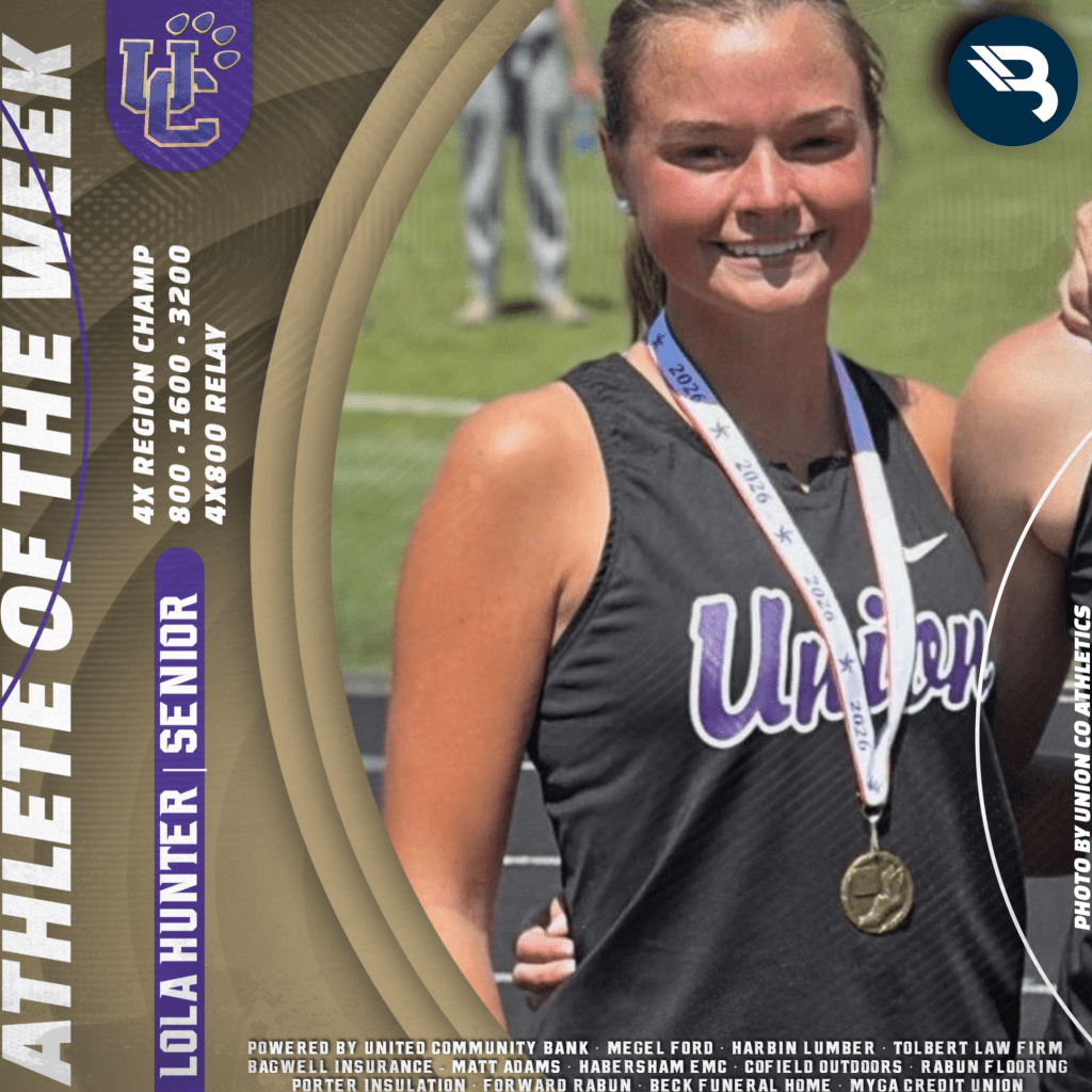 Lola Hunter added four more region titles to her collection. The Union County senior distance star won the 800 (2:31.14), 1600 (5:42.18), and 3200 (13:08.15), then also won the 4×800 Relay to help the Lady Panthers to a team region title. This is her 8th career POW award.