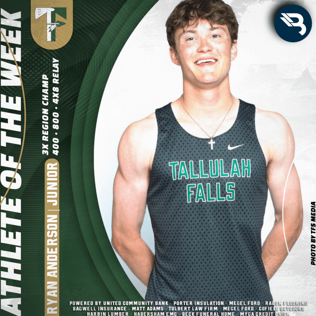 Ryan Anderson was the region champ in the 400 (51:02) and 800 (1:59.77), and was 3rd in the 1600 (4:40.81) while also starring in the 4×800 region title winning relay for Tallulah Falls. This is the junior’s first POW award.