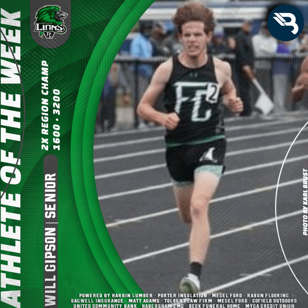 Franklin County state champion Will Gipson ran his way to a pair of region titles in the championship meet. The senior won the 1600 (4:36.41) and the 3200 (10:20.54). This is his third career POW award.