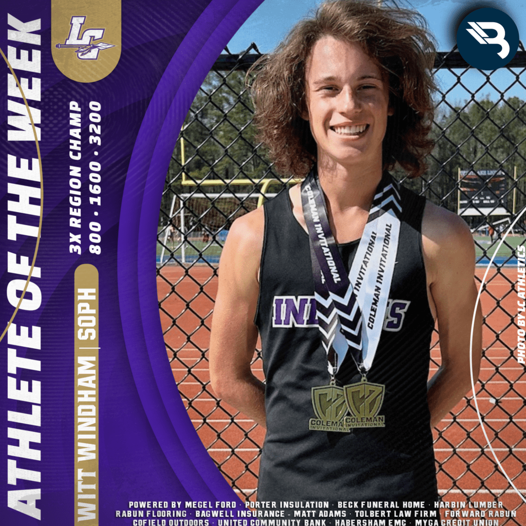 Witt Windham obliterated the distance events, winning the 3200 (9:47.90), 1600 (4:31.02), and 800 (1:57.92). The Lumpkin County sophomore wins his 7th career POW award.