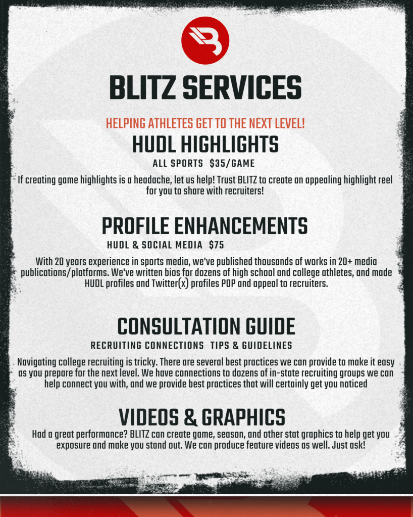 We already highlight, spotlight, and honor the local kids. But we’ve been asked to help produce and post to help gain recruiting traction. We have a great relationship with several colleges and even pro teams when they inquire about local athletes. From creating HUDL highlight reels (per game, month, or season), to posts and tags to recruiting agencies on social media, we have gone above and beyond our normal highlighting of the local teams. We’ve done the following and can offer the same. Inquire by emailing brian@blitzsportsga.com for ideas and full quotes.